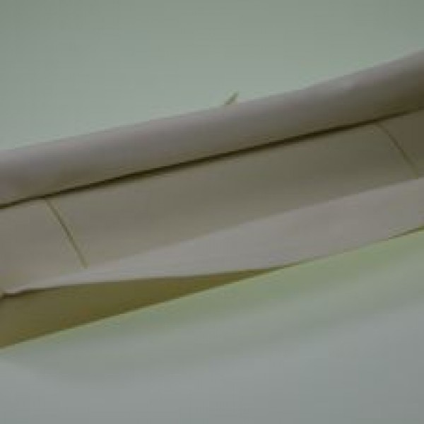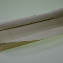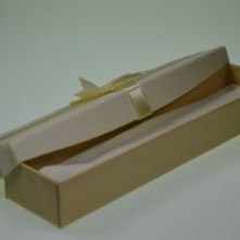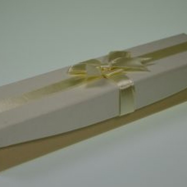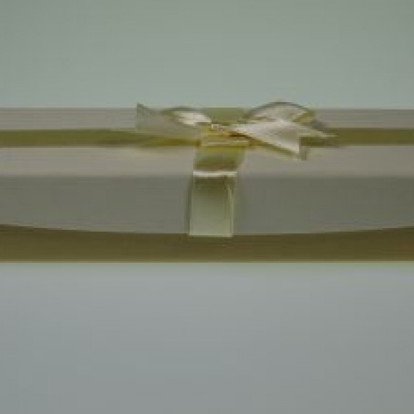 Ribbed paper covered card box with beige base and cream lid with cream satin bow and 2 colour card gift tag. Interior fitted with suedette wrap and white pads. Supplied in a white card sleeve.