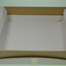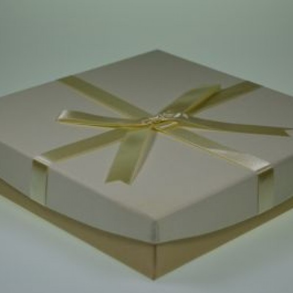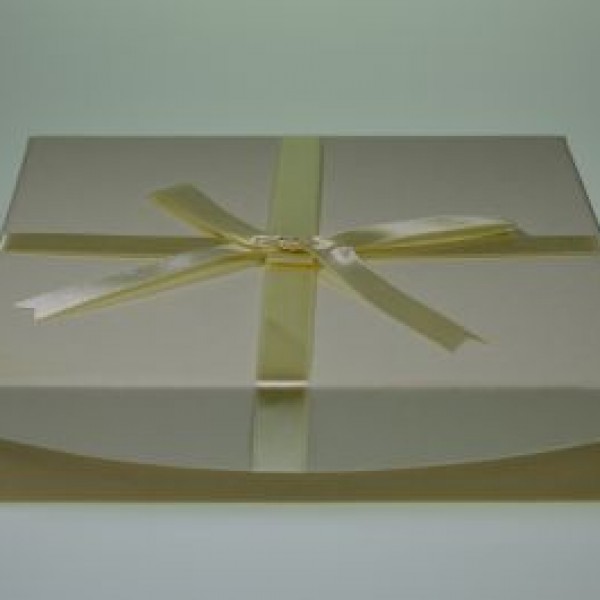 Ribbed paper covered card box with beige base and cream lid with cream satin bow and 2 colour card gift tag. Interior fitted with suedette wrap and white pads. Supplied in a white card sleeve.