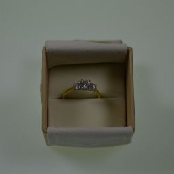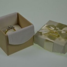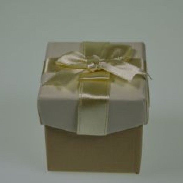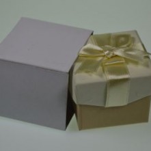 Ribbed paper covered card box with beige base and cream lid with cream satin bow and 2 colour card gift tag. Interior fitted with suedette wrap and white pads. Supplied in a white card sleeve.