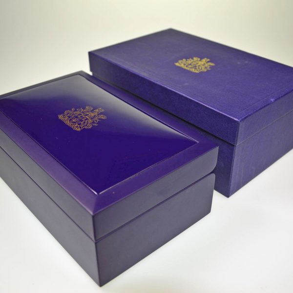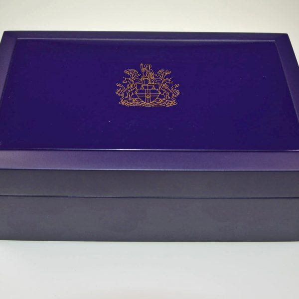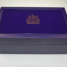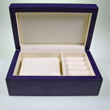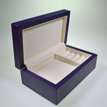 Matt wood cases with a glossy wood lid-top inlay. Lid liners, 2 piece, card packer box and pad materials/colours can be customised as required. N.B SPECIAL ORDER ONLY. Allow up to 16 weeks for delivery. **PA5311/R RING CASE-BLUE OR BLACK ONLY,WITH CREAM COVERLIM PADS, NOW AVAILABLE FROM STOCK**
