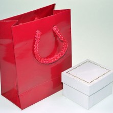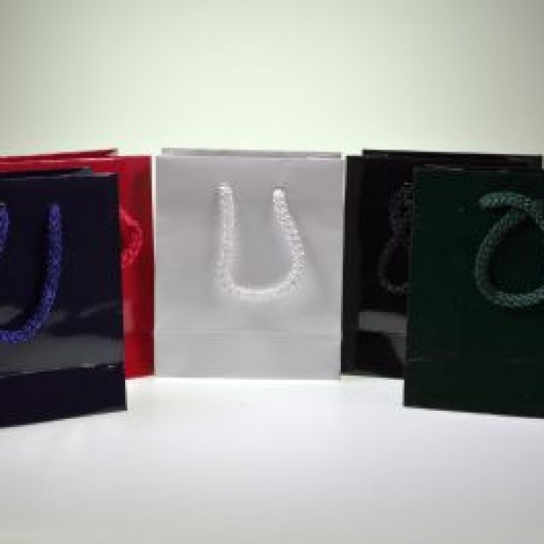 Laminated gloss paper bags with matching colour cord handles, available in 4 sizes and 5 colours – Red, White, Blue, Black and Green. Printable.