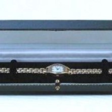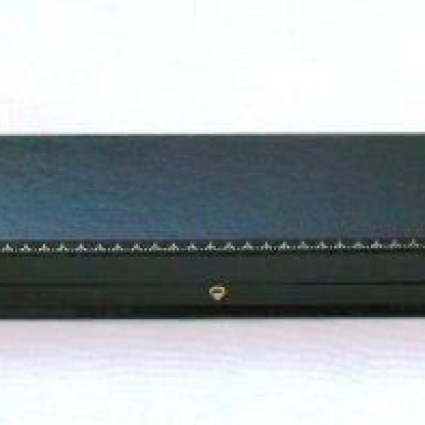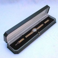 These high quality cases are based on a traditional design, incorporating a push button closure, with a flange base. Available in Black, Blue or Green textured leatherette with cream satin lid liners and corresponding colour velvet pads or alternatively cream velvet pads. All are supplied with a 2 piece, card packer box.