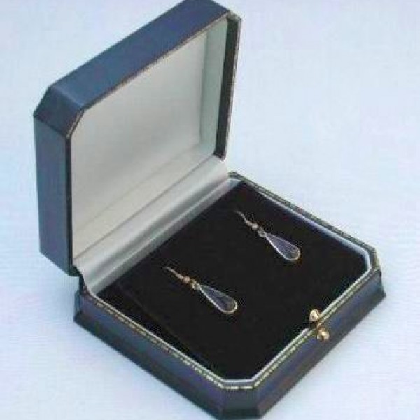 These high quality cases are based on a traditional design, incorporating a push button closure, with a flange base. Available in Black, Blue or Green textured leatherette with cream satin lid liners and corresponding colour velvet pads or alternatively cream velvet pads. All are supplied with a 2 piece, card packer box.