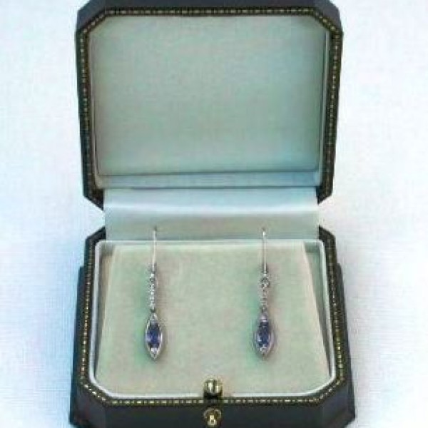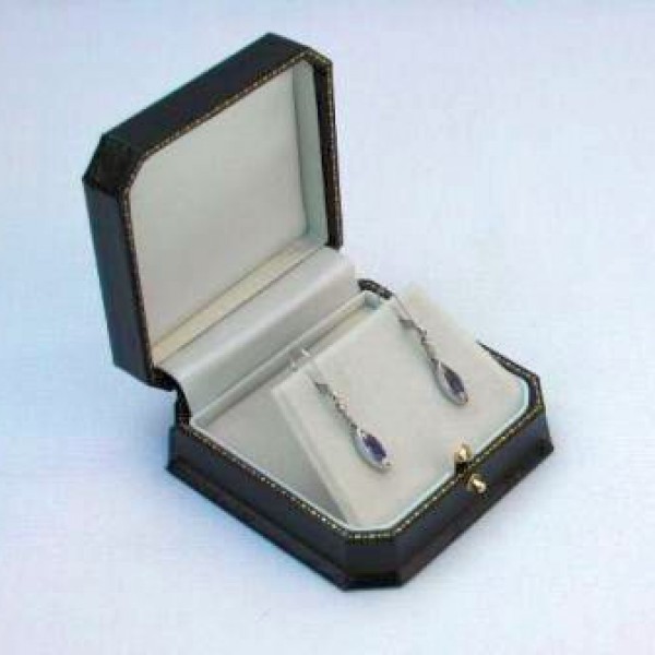 These high quality cases are based on a traditional design, incorporating a push button closure, with a flange base. Available in Black, Blue or Green textured leatherette with cream satin lid liners and corresponding colour velvet pads or alternatively cream velvet pads. All are supplied with a 2 piece, card packer box.