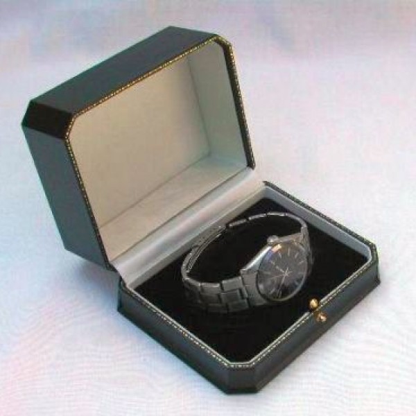These high quality cases are based on a traditional design, incorporating a push button closure, with a flange base. Available in Black, Blue or Green textured leatherette with cream satin lid liners and corresponding colour velvet pads or alternatively cream velvet pads. All are supplied with a 2 piece, card packer box.