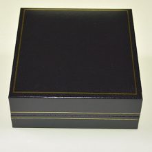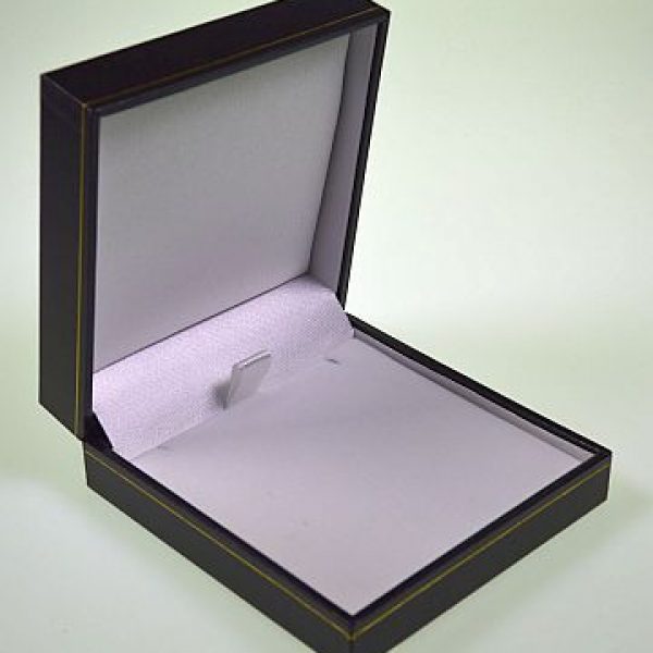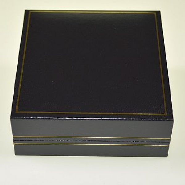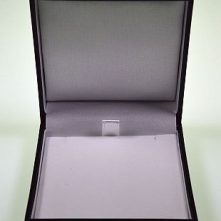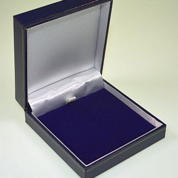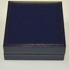 A premium quality, yet inexpensive leatherette covered case with white satin lid liner and velvet pads. Available in black, blue, green, burgundy and red with corresponding colour velvet pads. Alternatively, some black, blue, burgundy and red cases are available with white pads and some green cases are available with cream pads. All are supplied with a white card sleeve.