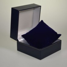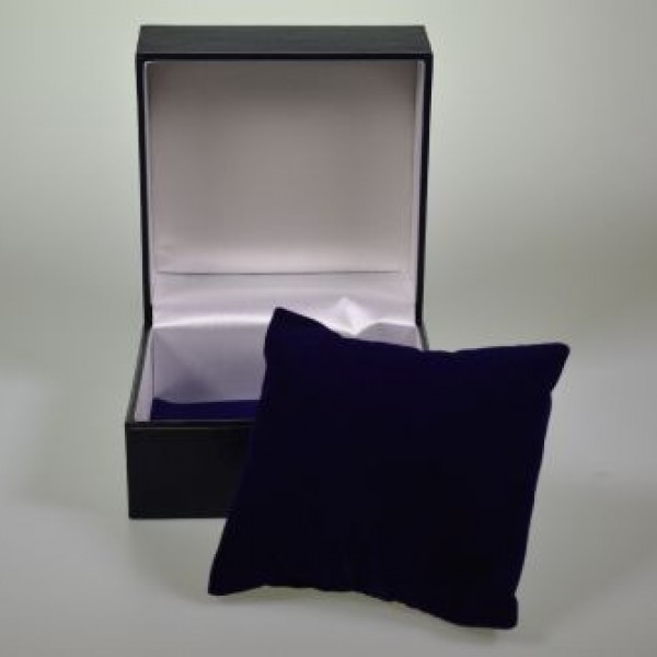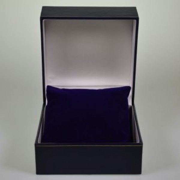A premium quality, yet inexpensive leatherette covered case with white satin lid liner and velvet pads. Available in black, blue, green, burgundy and red with corresponding colour velvet pads. Alternatively, some black, blue, burgundy and red cases are available with white pads and some green cases are available with cream pads. All are supplied with a white card sleeve.